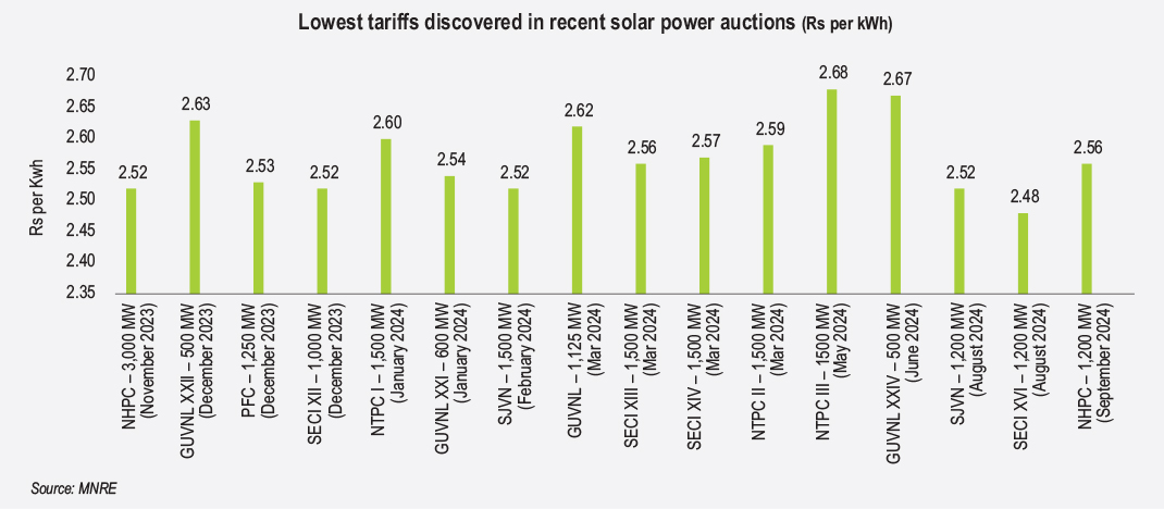 Furthermore, Renewable Watch Research tracked 16 solar power auctions between November 2023 and October 2024, with the lowest tariffs ranging from Rs 2.48 per kWh to Rs 2.68 per kWh. The lowest tariffs were discovered in Solar Energy Corporation of India Limited (SECI) Tranche XVI 1,200 MW auction, conducted in August 2024. In this auction, Sustainable and Affordable Energy for Life Industries Limited and NTPC Limited secured 250 MW and 200 MW respectively, by quoting a tariff of Rs 2.48 per kWh each. Meanwhile, BluPine Energy quoted a tariff of Rs 2.49 per kWh and won 50 MW in this auction. In NTPC’s May 2024 auction to develop 1,500 MW of grid-connected solar power projects (Phase III), Apraava Energy won 50 MW by quoting the lowest tariff of Rs 2.68 per kWh (upper range of the L1 tariffs bid during the year). While Avaada Energy won 750 MW, JSW Energy secured 400 MW and ReNew 300 MW by quoting a tariff of Rs 2.69 per kWh each in this auction. Additionally, auctions held during this period in Gujarat saw tariffs ranging from Rs 2.54 per kWh to Rs 2.72 per kWh. In the auctions conducted by various central PSUs, tariffs ranged from Rs 2.52 per kWh to Rs 2.69 per kWh.