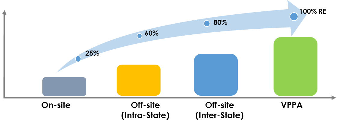 - Offsite interstate: Procuring renewable energy via intrastate OA (the renewable energy generators and C&I consumer are in the different states). Replacement from renewable energy to an extent of ~80-85 per cent of the energy consumption from the grid.