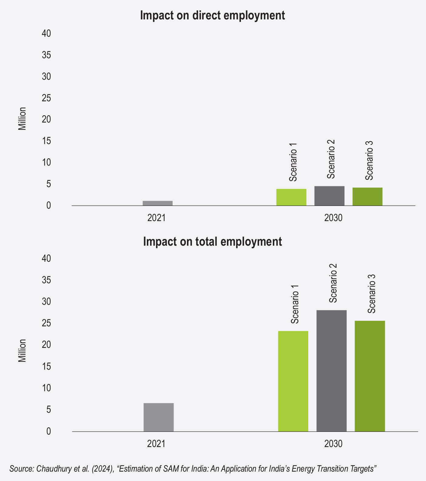 The SAM further highlights sectoral interdependencies and the ripple effects of renewable energy investments. Sectors such as manufacturing, construction and services benefit indirectly from increased demand for renewable energy infrastructure, equipment and associated services. These effects highlight the importance of coordinated policy efforts to maximise the socio-economic benefits of the energy transition. The graph illustrates the differences in direct and total employment across the three scenarios, highlighting the outsized impact of renewable energy investments on job creation. The visual representation underscores the potential for renewable energy to drive inclusive growth, particularly in rural and underdeveloped regions where such investments are likely to have the greatest impact.