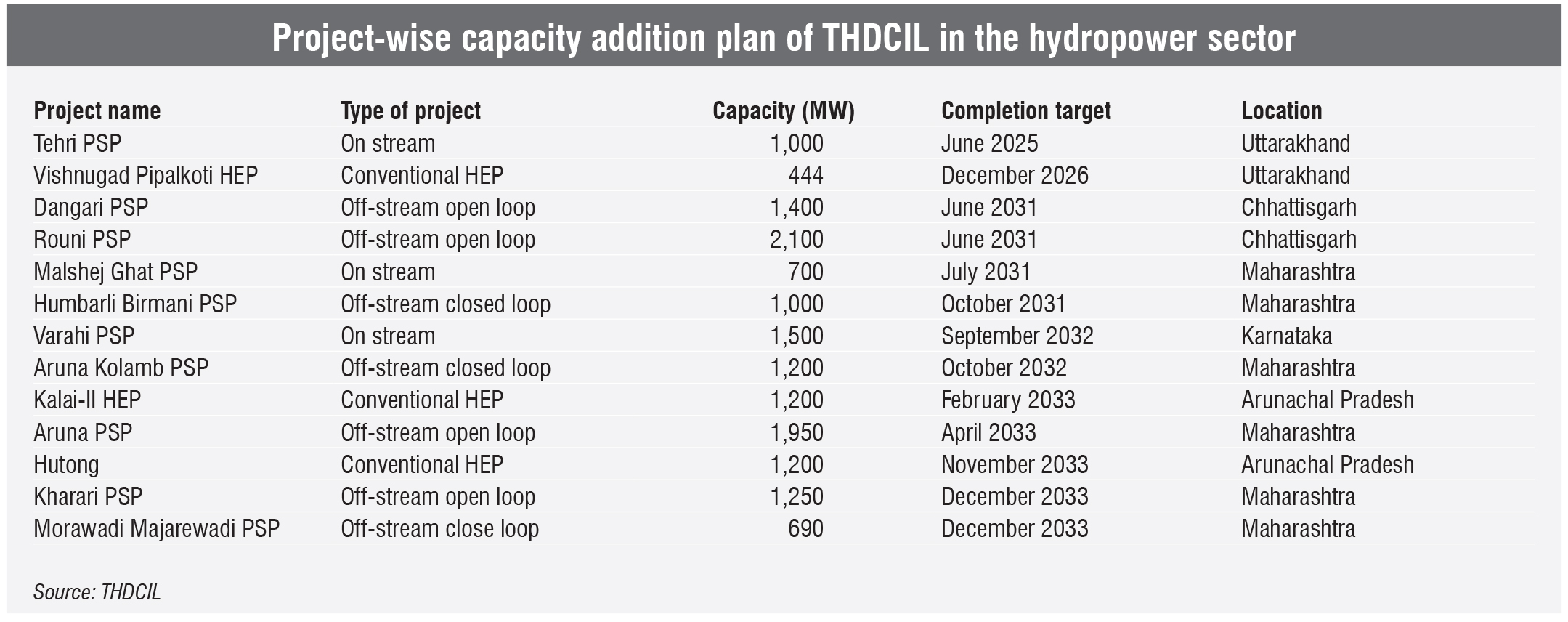 THDCIL signed an MoU with the Maharashtra government in September 2024 for the development of six PSPs, with a total capacity of 6,790 MW. The DPR preparation for these projects is currently in progress. In Chhattisgarh, the PSU has identified two PSPs – the 2,100 MW Rouni PSP and the 1,400 MW Dangari PSP, and is actively pursuing project allotment with the state government.
