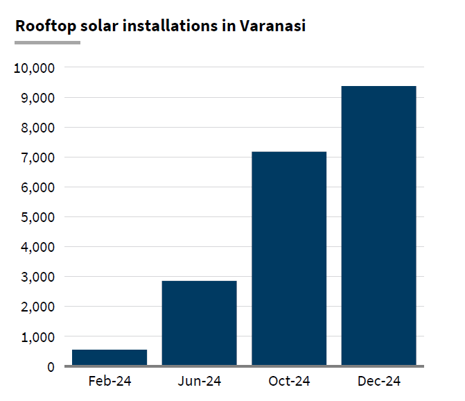 India has nearly doubled the total home rooftop capacity in 10 months, including 15 times growth in Varanasi. PM Surya Ghar: Muft Bijli Yojana (PMSGMBY) scheme from the national government, aimed at solarising 10 million homes by 2027. Various initiatives by the the government were responsible for this success of PMSGMBY. These include:
