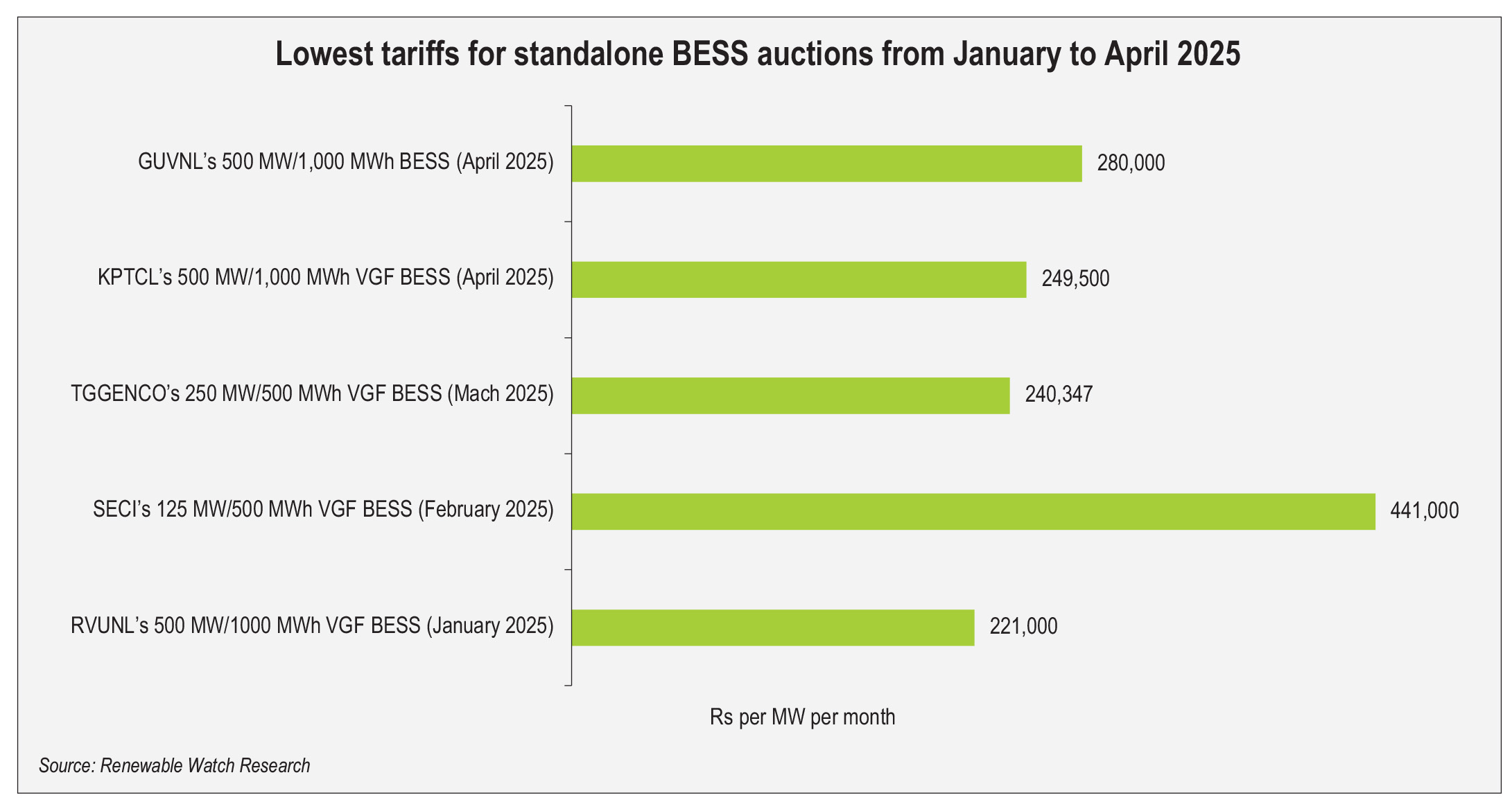 In March 2025, Telangana Power Generation Corporation’s (TGGENCO) VGF tender for 250 MW/500 MWh standalone BESS was auctioned, with Bondada Engineering securing 50 MW/100 MWh at Rs 240,347 per MW per month, while Oriana Power and Pace Digitek won 50 MW/100 MWh and 125 MW/250 MWh at nearly same tariffs of Rs 245,152 per MW per month and Rs 245,153 per MW per month respectively.