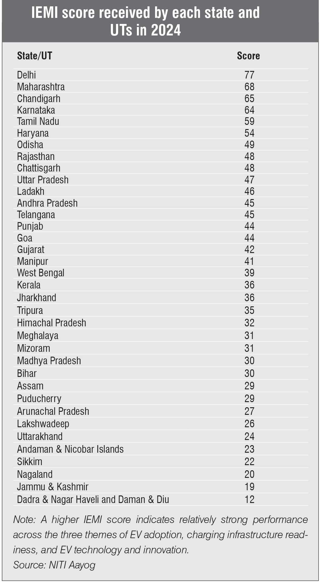 NITI Aayog recently launched the India Electric Mobility Index (IEMI) 2024 report. The report comprehensively tracks and benchmarks the progress of states and union territories (UTs) in achieving their electric mobility goals. It utilises open data sets as well as government data sets to capture the changes occurring in the evolving EV ecosystem. It also reflects the subnational-level progress, and challenges and opportunities that states and UTs face in their performance while transitioning to e-mobility. This data page covers two indices from the report…