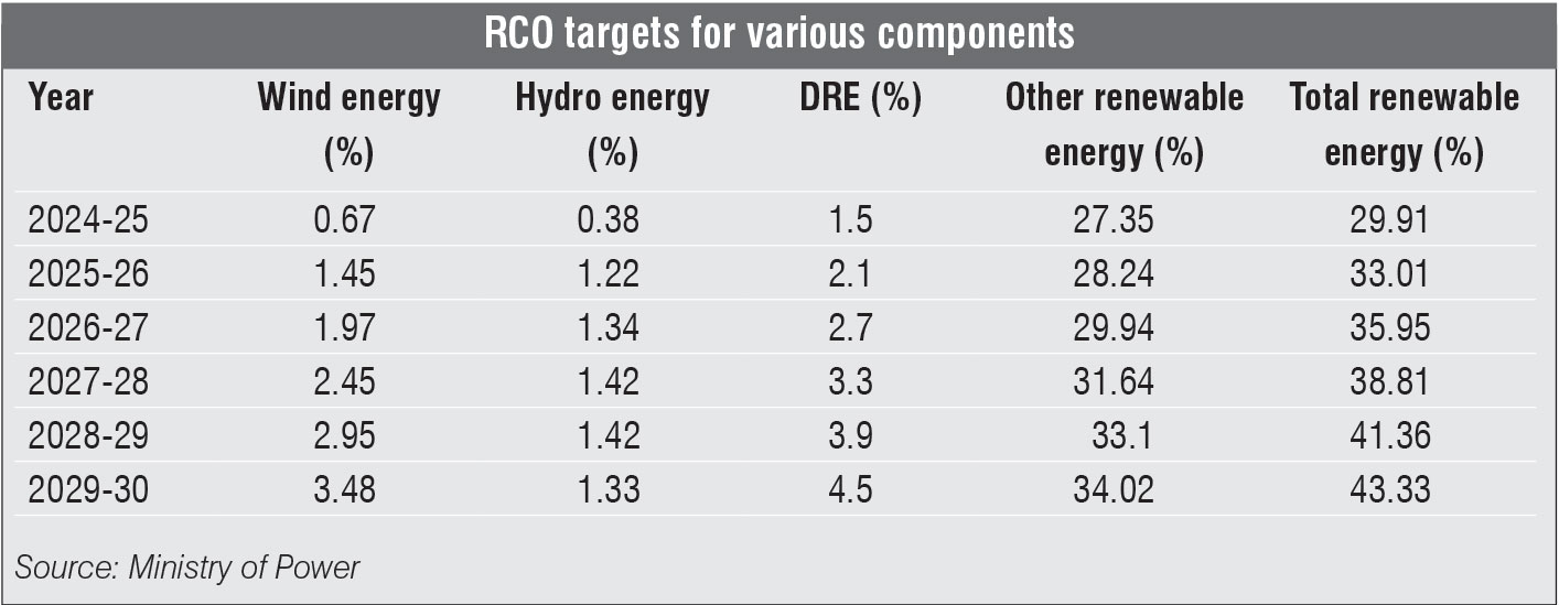 In the July draft, the RCO comprises four components – wind, hydro, distributed renewable energy (DRE) and other renewables, each with separate targets for each year. Notably, the share of DRE is mandated to rise from 1.5 per cent in 2024-25 to 4.5 per cent by 2029-30.