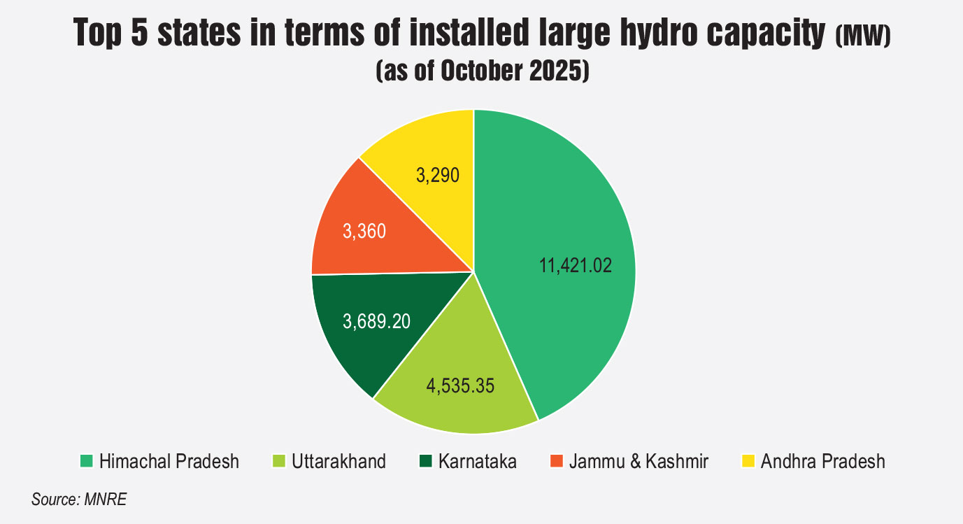 The hydropower landscape remained dynamic in 2025, marked by several MoUs, tender bids, auctions and commissioned projects. In March 2025, SJVN Limited signed an MoU with the Chhattisgarh government and Chhattisgarh State Power Generation Company Limited to develop an 1,800 MW pumped hydro storage project (PHSP) in Balrampur district. The total investment for the project is estimated at Rs 95 billion. Furthermore, Uttar Pradesh Power Corporation Limited (UPPCL), in April 2025, issued tenders for 2 GW of PHSPs to increase the state’s energy storage capacity. In April 2025, the CEA approved DPRs for six PHSPs totalling 7.5 GW. In September 2025, Madhya Pradesh Power Management Company Limited, on behalf of Madhya Pradesh discoms and UPPCL, issued a tender to procure 500 MW of energy storage capacity from interstate transmission system (ISTS)-connected PSPs. In November 2025, Adani Green Energy Limited announced plans to invest Rs 150 billion for the installation of two PSPs with a combined capacity of 2,700 MW in Assam. In the same month, the Maharashtra government signed a Rs 80 billion MoU with Haryana’s GSC PSP Maha Private Limited for the development of the 1,500 MW Panchmauli-Devalipada PHSP in Dhule and Nandurbar districts.