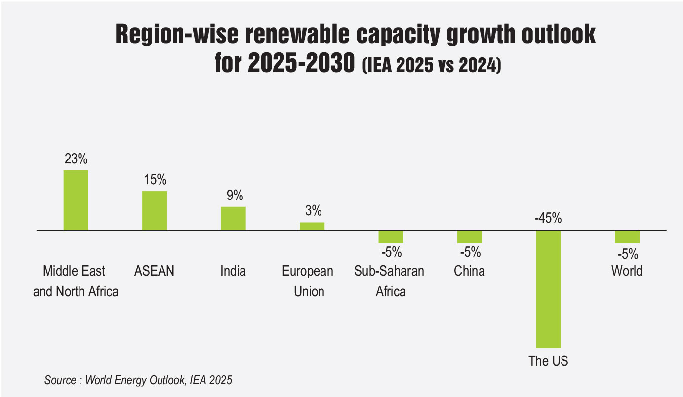In 2025, only three years after initiating the Inflation Reduction Act (IRA), the US significantly altered the course of its energy transition. The One Big Beautiful Bill Act, passed in July 2025, was a reversal of the progress on energy transition made during the IRA era. For starters, the bill prohibits projects sourcing components from “prohibited foreign entities” (mostly Chinese companies) with the risk of disqualification. It also imposes new barriers for developers by accelerating the phase-out timelines. As a result, the IEA’s Renewables 2025 forecast has marked a 50 per cent “downward” revision in US renewable energy capacity additions across nearly all technologies, with solar expected to decline by about 40 per cent and wind by 60 per cent. According to official press releases from the White House, the new administration has signalled its formal exit from the Paris Agreement. Despite this setback, there is a positive trend in demand for round-the-clock renewables from technology companies. According to McKinsey’s Global Energy Perspective 2025, with power demand likely to triple in the next three years, tech majors such as Google, Amazon, Microsoft, and Meta have firmed up plans to invest in solar plus storage solutions to scale up facilities. Overall, the US renewable energy landscape in 2025 presents a paradox: it is experiencing one of the largest surges in demand for AI-powered renewable energy while simultaneously witnessing cuts in federal commitments to the clean energy transition.