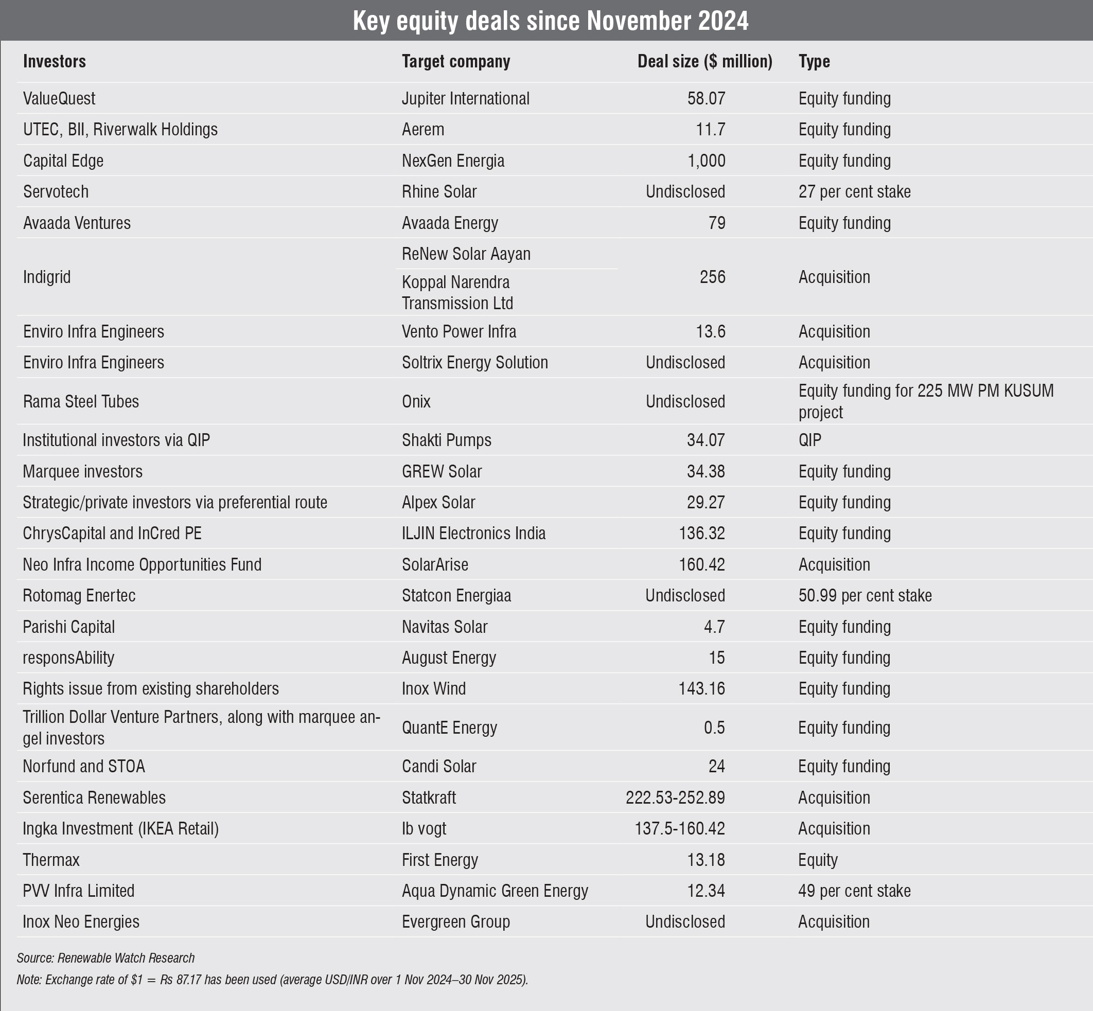 Some of the most significant equity deals over the past year were NexGen Energia’s $1 billion equity investment from Capital Edge to scale compressed biogas infrastructure in April 2025, IREDA’s $234.7 million QIP in June 2025 to strengthen its lending capacity for renewables and Inox Wind’s $143 million rights issue in July 2025 to raise funds to support its expansion plans across the wind supply chain. These deals indicate that PE and institutional investors are focusing on companies with clear and credible deployment pipelines.