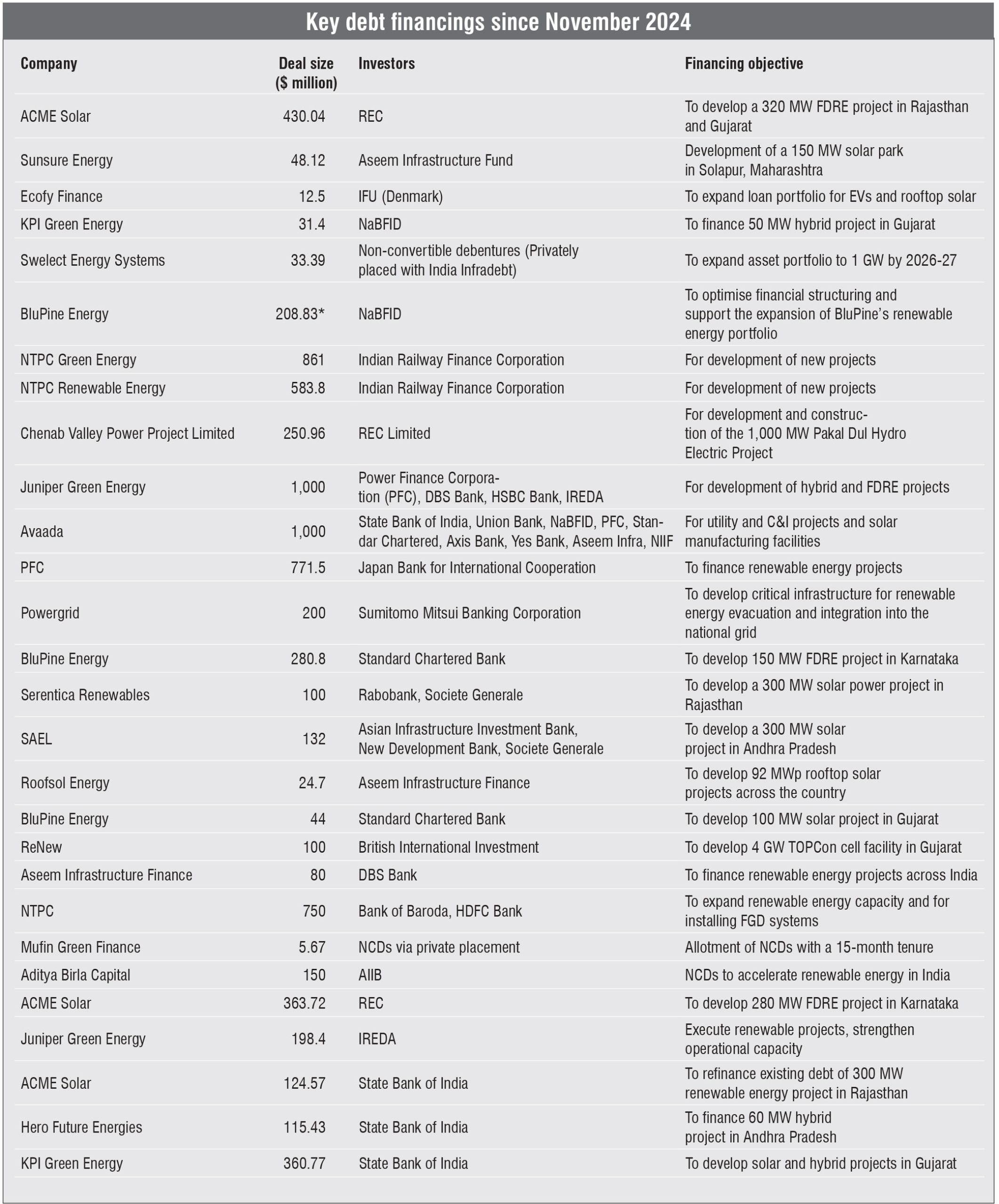 Some of the major debt deals that were signed over the past year include ACME Solar’s $430.04 million loan from REC in November 2024 to fund the development of a 320 MW firm and desptachable renewable energy project in Rajasthan and Gujarat; PFC’s $771.5 million loan from JBIC for renewable energy project financing in January 2025; and NTPC Green Energy Limited’s (NGEL) $861 million loan from IRFC in March 2025. These transactions over the past year indicate that both PSU as well as private developers are securing large, long-tenor loans from NBFCs, underscoring their critical role in renewable funding.