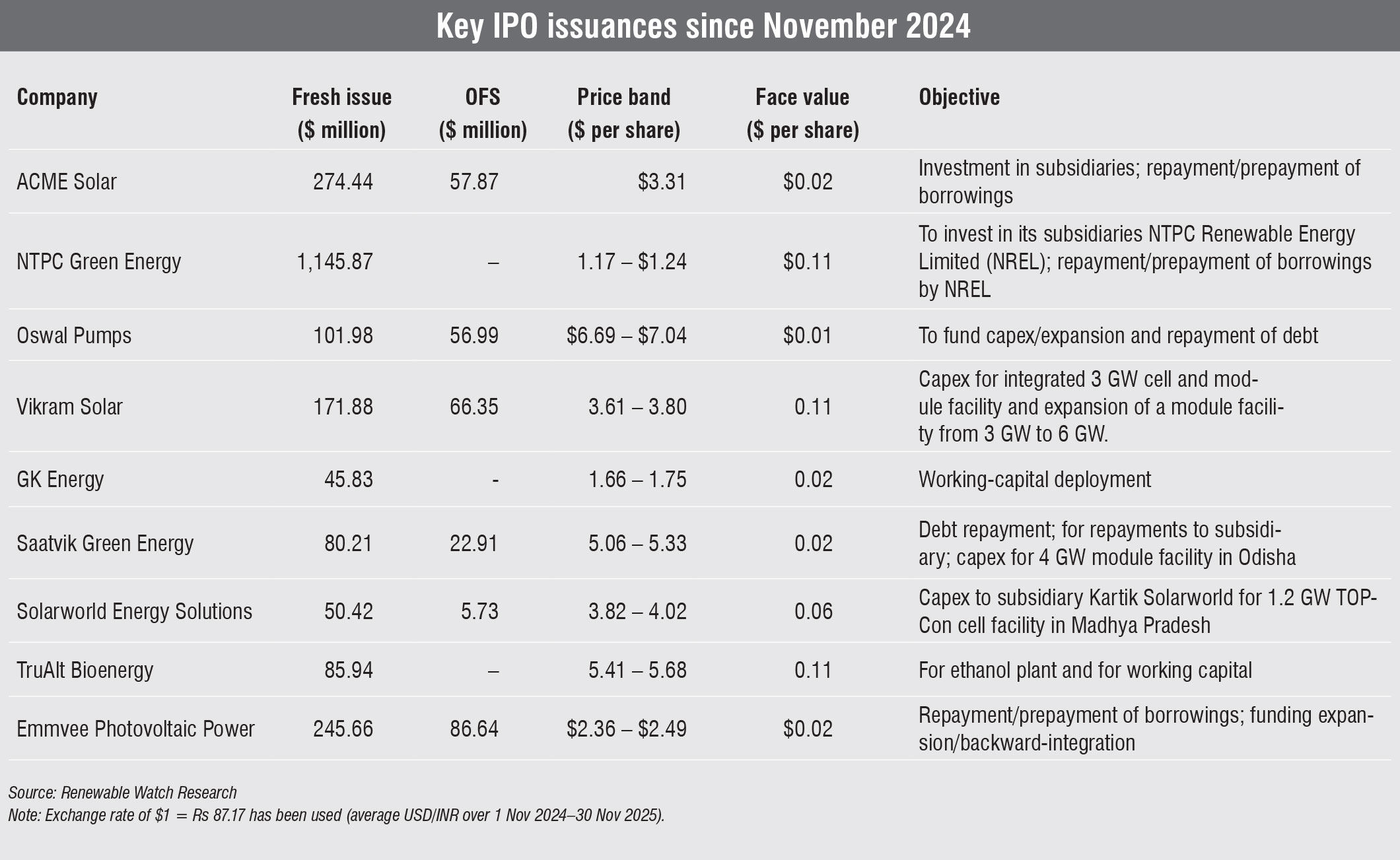 Public listings have emerged as an important capital-raising strategy for renewable energy companies. Over the past year (from November 2024 to November 2025), the total fresh-issue capital raised through IPOs amounts to $2,498.72 million, including offer for sale, as tracked by Renewable Watch Research. Key issuances included ACME Solar’s $274.44 million IPO and NGEL’s $1,145.87 million IPO, both issued in November 2024; Vikram Solar’s $171.88 million IPO in August 2025; and Emvee Photovoltaic Power’s $245.66 million IPO in November 2025.