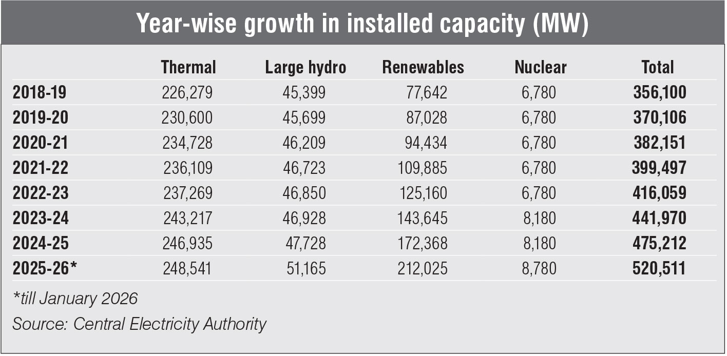 The installed power capacity grew at a compound annual growth rate (CAGR) of 4.96 per cent between 2018-19 and 2024-25. While conventional power capacity has grown at a CAGR of 1.46 per cent during the past six years, renewable energy (excluding large hydro) has surged ahead and grew at a CAGR of 10.17 per cent driven by falling costs of renewable electricity generation, robust government policies, record investments, cost-reflective tariffs, rapid tendering and project allocation activities. Further, as per the CEA’s General Review Report 2025, the installed capacity of captive power plants in India reached around 80,926.07 MW.