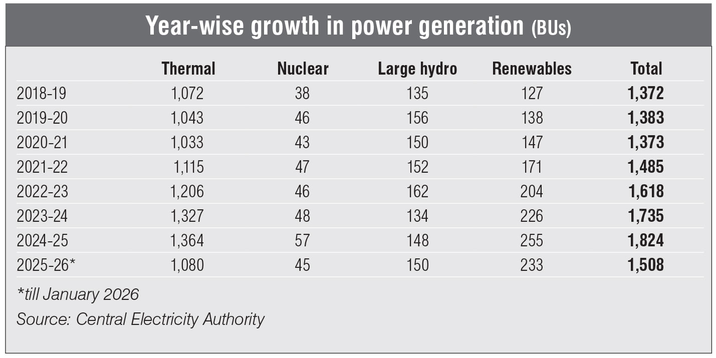In 2024-25, about 33,399 MW of generation capacity was added. The renewable energy segment contributed to the highest capacity addition of 28,724 MW, followed by thermal (3,875 MW) and hydro (800 MW). In 2025-26 (till January 2026), the generation capacity addition reached 52,537 MW, which comprised 39,657 MW of renewable energy sources. The cumulative electricity generation grew at a CAGR of 4.86 per cent between 2018-19 and 2024-25. Likewise, the thermal generation grew at 3.93 per cent and renewable energy generation at 12.36 per cent during this period.