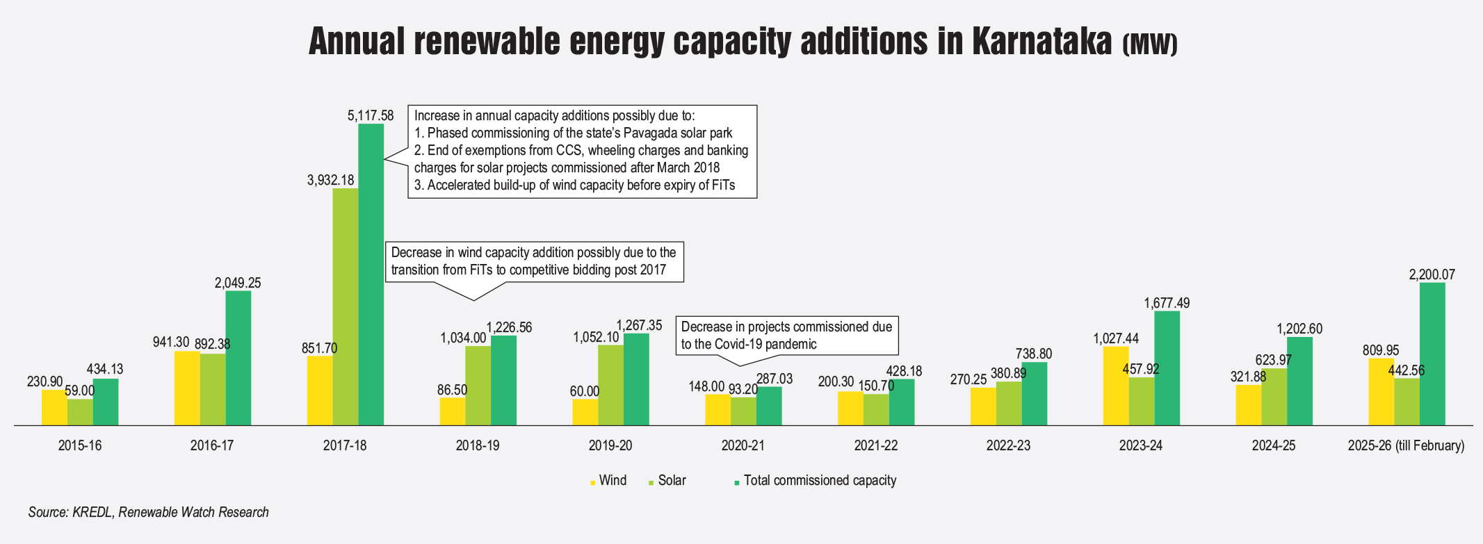 Several interesting trends have emerged in Karnataka over the years across the power sector value chain. Renewable energy commissioning has followed a highly uneven pattern (refer to the graph). Until 2015-16, annual capacity additions remained below 500 MW. Post that, commissioned capacity increased, with an exceptional peak in 2017-18, when more than 5,100 MW was added in a single year. This peak can be attributed to solar capacity additions of 3,932.18 MW. One reason for this was the phased commissioning of the state’s Pavagada solar park, which began around this period.